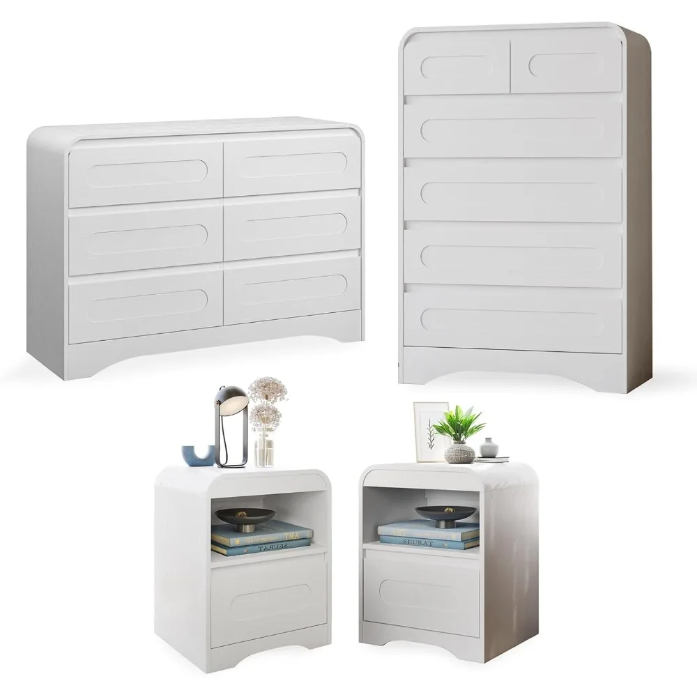 - 4-Piece Modern Wooden Bedroom Set: Includes 1 wide 6-drawer chest, 1 tall 6-drawer dresser, and 2 side tables.