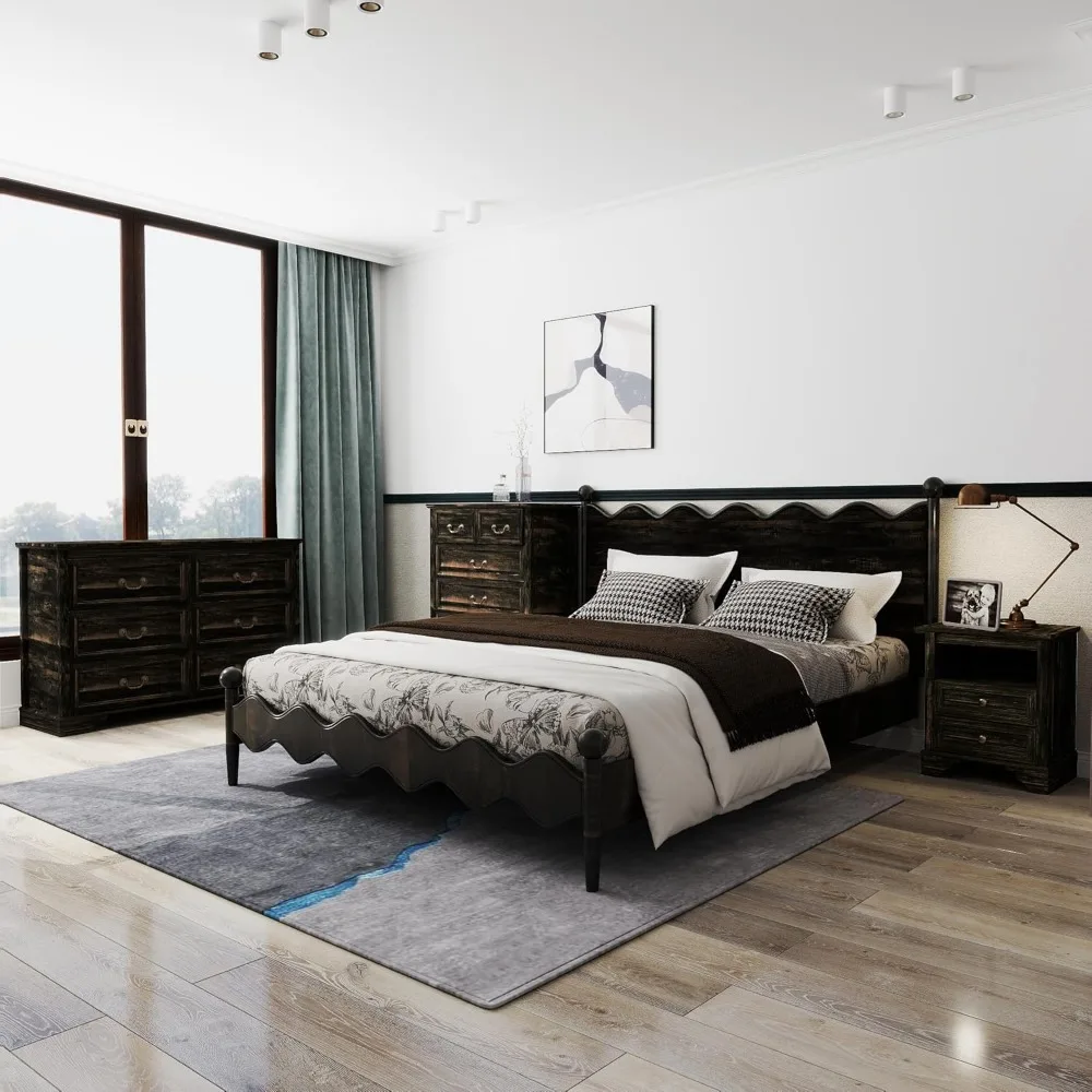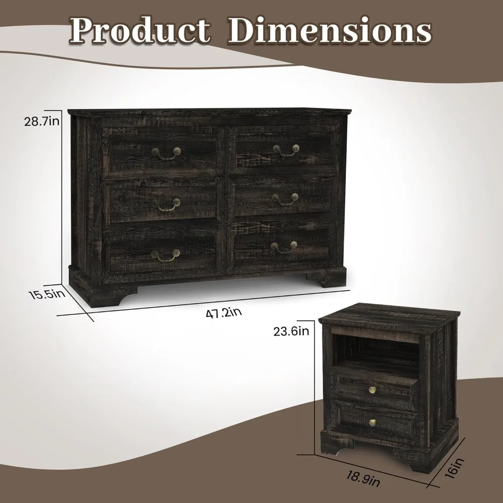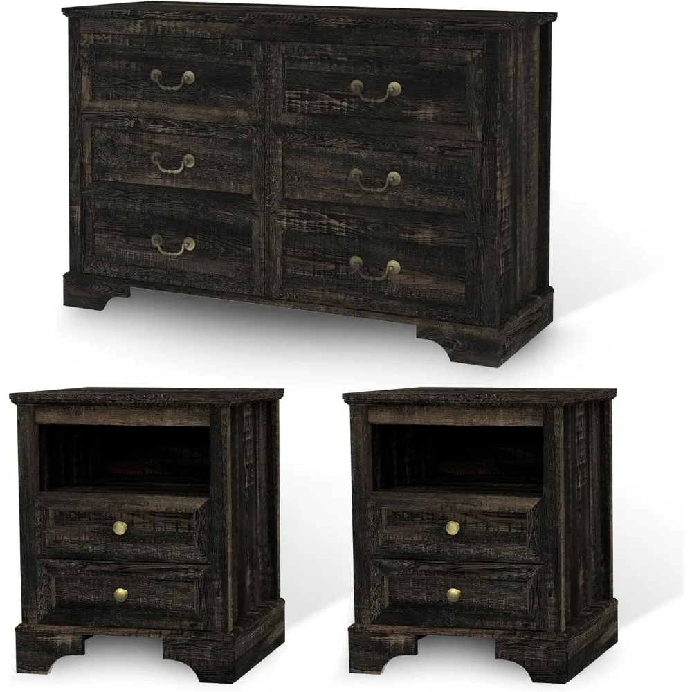 Farmhouse Bedroom Set, 3 Pieces Bedroom Furniture Set, Rustic Wood 6 Drawer Dresser and 2 Nightstands.