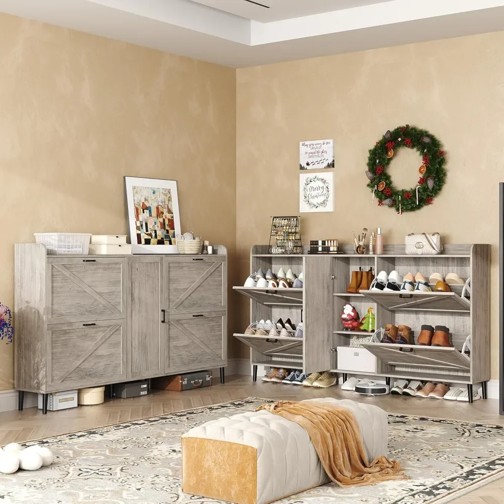 Large Shoe Cabinet with 4 Flip Drawers, Farmhouse Narrow Shoe Organizer Cabinet for Entryway, Hidden Shoe Rack w/ Adjustable Sto