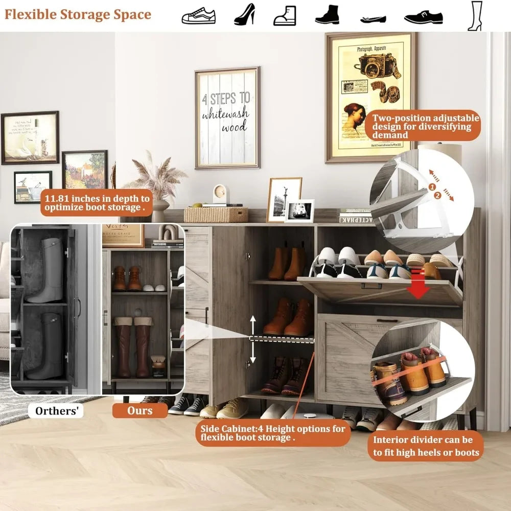 【Large Capacity Shoe Storage for the Whole Family】This shoe cabinet is designed to provide ample storage space, allowing you to store shoes compactly and keep them hidden while still being easily accessible. It features four flip-out drawers, each with two layers, providing a total capacity for 32 pairs of shoes. To maximize storage, the cabinet also includes a three-tier side compartment that can hold up to three pairs of boots. Additionally, the 5.31-inch high floor clearance offers extra storage for 9 pairs of shoes and makes daily cleaning easier.