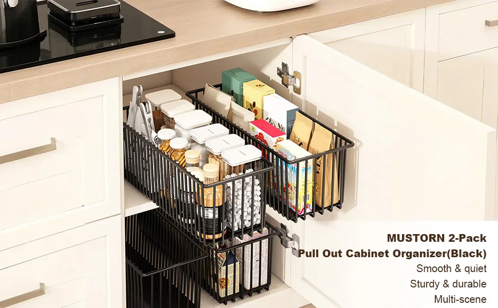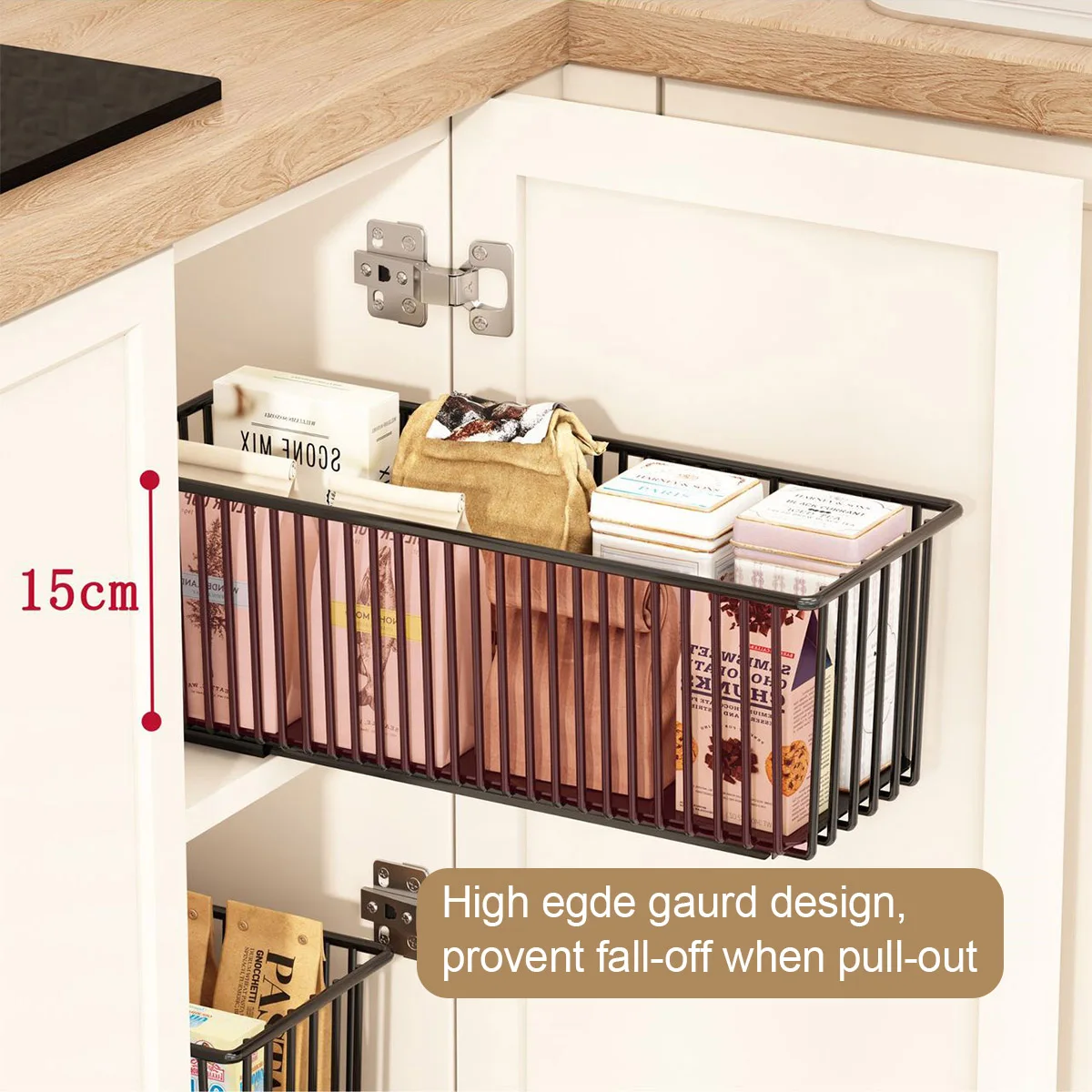HIGH LOAD-BEARING CAPACITY: Crafted from heavy-duty carbon steel, the slide out drawers for kitchen cabinets provide sturdy construction and high load-bearing capacity. It is resistant to water, rust, and corrosion for long-lasting use.