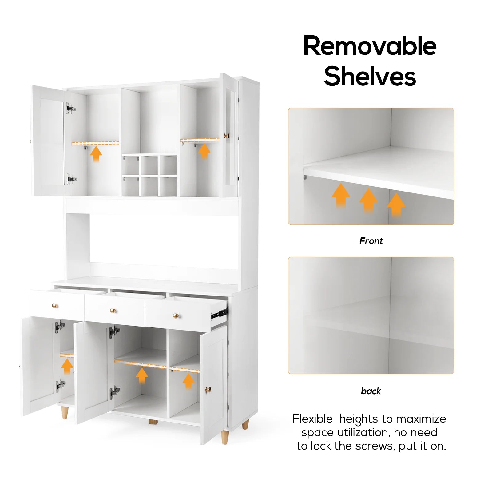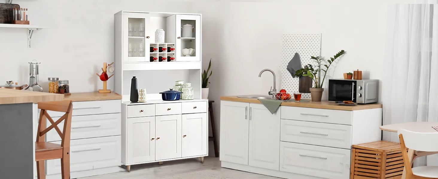 Lots of Storage: This pantry cabinet includes 5 door cabinets and 3 pull-out drawers provides more space to keep mugs, jars, plates and bowls organized. The open countertop is perfect for storing microwave oven, electric cooker, baking accessories.